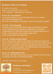 Elk van deze sessies raakt een thema aan dat sterk beroerd wordt tijdens de Overgang. Biodanza nodigt ons uit tot het bewegen en be-leven van wat in ons omgaat.